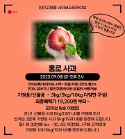실시간 방송판매 구매인증 사은행사로는 ▲선물용 사과 5kg(13과 이하)을 구매한 선착순 3명과 ▲30번째, 60번째, 90번째(30명 단위) 구매고객에게 가정용 홍로사과 5kg(19과)를 추가 증정할 계획이다.