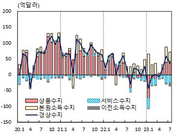 8일 한국은행이 발표한 ‘2023년 7월 국제수지(잠정)’에 따르면 경상수지는 지난 5월부터 석 달 연속 흑자를 기록했다.