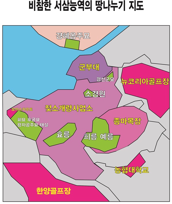 젖소개량사업소, 종마 목장, 한양 컨트리클럽, 뉴코리아 컨트리클럽, 농협대학, 보이스카우트 수련원, 군부대 등이 서삼릉 능역을 훼손한 시설물들이다.