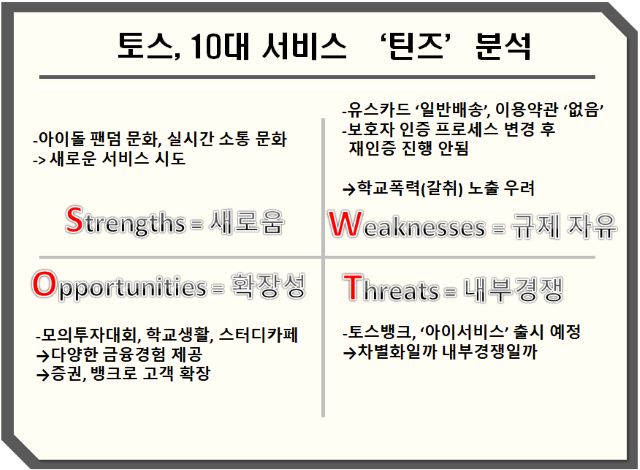 (서울=NSP통신) 강수인 기자 = ‘금융소비자’의 연령이 만 7세 이상으로 낮아졌다. 이에 따라 어린 금융소비자들을 조금이라도 더 오래 앱(App) 안에 머물게 하기 위해 금융앱들은 학교 수업시간표, 용돈관리, 기부 활동 등 다양한 기능들로 차별화를 시도하고 있다. 이중 토스뱅크, 토스증권 등을 품은 토스에서 만 7세부터 이용 가능한 10대 금융서비스 ‘틴즈’가 인기를 끌고 있다. 시중은행 앱 안에서 존재하는 10대서비스와는 달리 토스라는 종합금융플랫폼에서 제공하는 10대서비스라 확장성, 다양성에는 높은 평가를 받지만 아이들의 자율성에 맡긴다는 부분이 미흡하다는 지적도 있다. 이에 토스의 10대서비스인 ‘틴즈’에 대해 SWOT분석으로 살펴봤다.