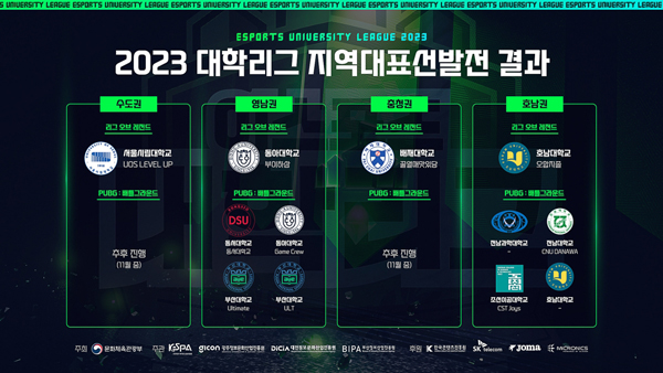 LoL 서울시립대(수도권), 배제대(충청권), 호남대(호남권), 동아대(영남권) 선발 완료…PUBG 호남권 및 영남권 대표팀 선발 완료, 수도권 및 충청권은 11월 중 선발 예정