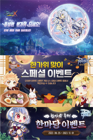 3D MMORPG 라그나로크X : Next Generation에서는 9월 21일부터 10월 4일까지 ‘한가위 대축제 이벤트’가 열린다. 이벤트 기간 동안 오딘을 소모하면 풍등을 얻을 수 있으며 풍등을 날리면 송편 재료를 획득 가능하다. 송편 재료를 모아 송편을 제작한 후 달빛 장터에서 머리 장식, 등 장식, 탈것 등으로 교환 가능하다.