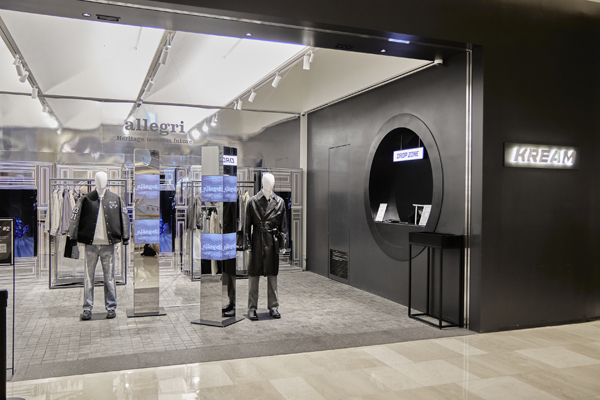 팝업스토어 현장은 알레그리가 시작한 이탈리아의 르네상스시대 건축물을 상징화한 구조물을 설치하고 거울, LED, 스크린 등을 인테리어 소재로 곳곳에 활용해 미래지향적인 패션을 추구하는 알레그리의 정체성을 표현했다.