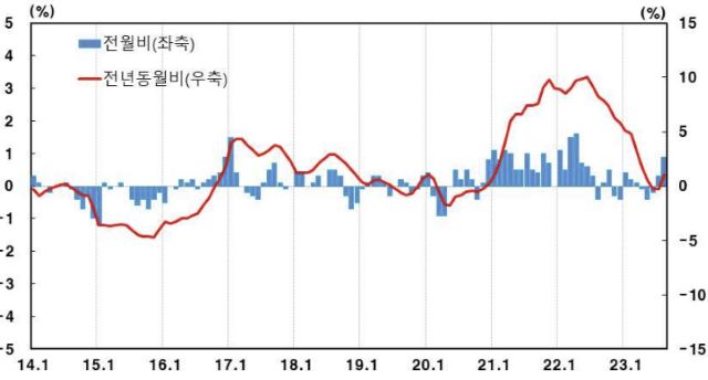 농림수산품은 농산물(13.5%)과 축산물(1.5%)이 올라 전월 대비 7.3% 상승했다. 공산품은 제1차금속제품(-0.3%) 등이 내렸으나 석탄 및 석유제품(11.3%), 화학제품(1.4%) 등이 올라 전월 대비 1.1% 상승했다.