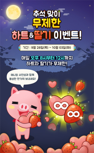 애니팡 사천성은 9월 28일부터 10월 3일까지 ‘무제한 하트&딸기’ 이벤트를 선보인다. 추석 연휴 동안 오후 8시부터 매일 4시간씩 재화 소모 없이 자유롭게 애니팡 사천성을 즐길 수 있는 무제한 이벤트는 퍼즐 플레이로 획득한 다양한 떡을 합쳐 다른 이용자와 경쟁을 벌이는 애니의 절구떡 이벤트와 함께 진행된다.