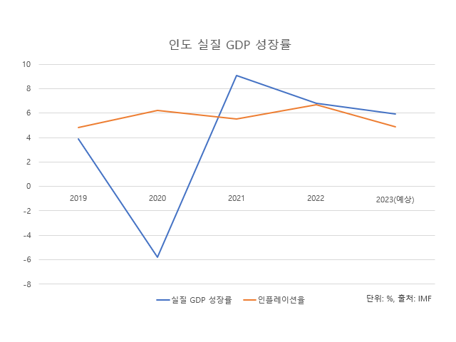 인도의 경제성장률 전망은 밝은 편이다. 국제통화기금(IMF)이 예상한 2023년 인도의 실질 국내총생산(GDP) 성장률은 5.9%다. 또한 2020년 -5.8%였던 실질 GDP 성장률이 2021년 9.1%, 2022년 6.8%로 증가해왔다. 2022년 기준 인도의 GDP는 3조 3850억 달러(4576조 1815억원)로 세계 GDP 순위 6위를 차지한 바 있다.