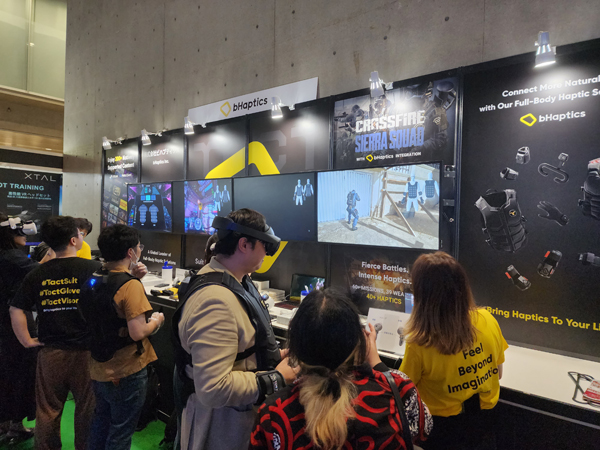 스마일게이트와 비햅틱스는 지난 21일부터 나흘간 일본 도쿄에서 진행된 도쿄게임쇼 2023 기간 중 비햅틱스 부스에 관람객들이 ‘택트슈트 X40’, ‘택토시 포 암즈’, ‘택트바이저’를 착용하고 시에라 스쿼드를 플레이할 수 있는 공간을 마련했다.