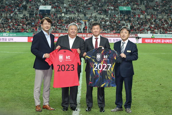(서울=NSP통신) 이복현 기자 = KT(대표 김영섭)가 지난 서울월드컵경기장에서 대한축구협회와 ‘축구 국가대표팀 공식 파트너 조인식’을 갖고 2027년까지 후원 협약을 연장했다.