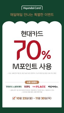 현대카드 ‘M70 프로모션’은 23일부터 11월 30일까지 진행된다. M포인트 적립 및 사용 가능한 현대카드 기소지 회원이라면 누구나 참여 가능하다. 뚜레쥬르와 제일제면소는 1회 결제 금액 기준 5만 원(최대 사용 3만5000 M포인트), 빕스와 더플레이스는 10만 원(최대 사용 7만 M포인트) 한도 내에서 매일 사용 가능하다.
