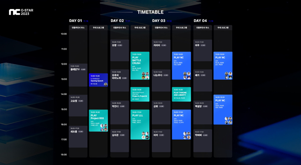11월 18일 오후 1시 30분 THRONE AND LIBERTY가 이용자 의견을 반영해 개선된 최신 버전을 직접 시연한다. 김블루, 쵸단, 우정잉, 여푸 등 유명 인플루언서와 함께 엔씨 출품작을 즐기는 PLAY NC 무대 행사도 11월 18일과 19일 이틀 동안 즐길 수 있다.