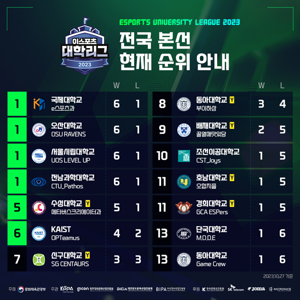 현재까지 ▲국제대학교 ▲오산대학교 ▲서울시립대학교 ▲전남과학대학교가 모두 6승 1패를 기록하며 공동 1위를 달리고 있으며, 그 뒤를 이어 ▲수성대학교 ▲카이스트 ▲신구대학교 ▲동아대학교(지역대표)가 5~8위를 기록하고 있다. 그다음 ▲배재대학교 ▲조선이공대학교 ▲호남대학교 ▲경희대학교 ▲단국대학교 ▲동아대학교(시드권)가 하위권을 이루고 있어서 반등이 필요하다.