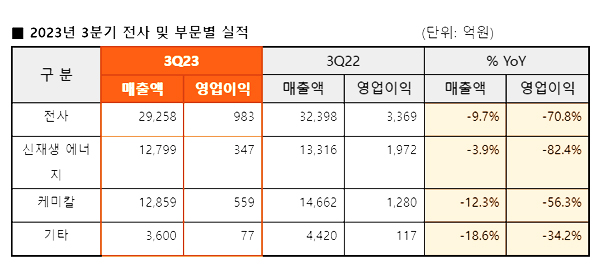 사업별로 보면 신재생 에너지 부문은 매출이 전년 동기 대비 3.9% 줄어든 1조2799억원, 영업이익은 82.4% 감소한 347억원을 기록했다. 태양광 모듈 판매량이 감소하고 판매마진이 축소되면서 영업이익이 줄었다.
