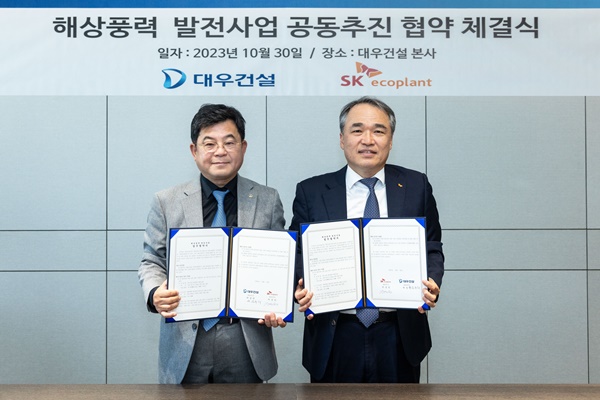 (서울=NSP통신) 강은태 기자 = 대우건설(대표 백정완)과 SK에코플랜트(대표 박경일)가 지난 30일 대우건설 본사에서 ‘해상풍력 발전사업 상호 협력을 위한 업무협약’을 체결했다.