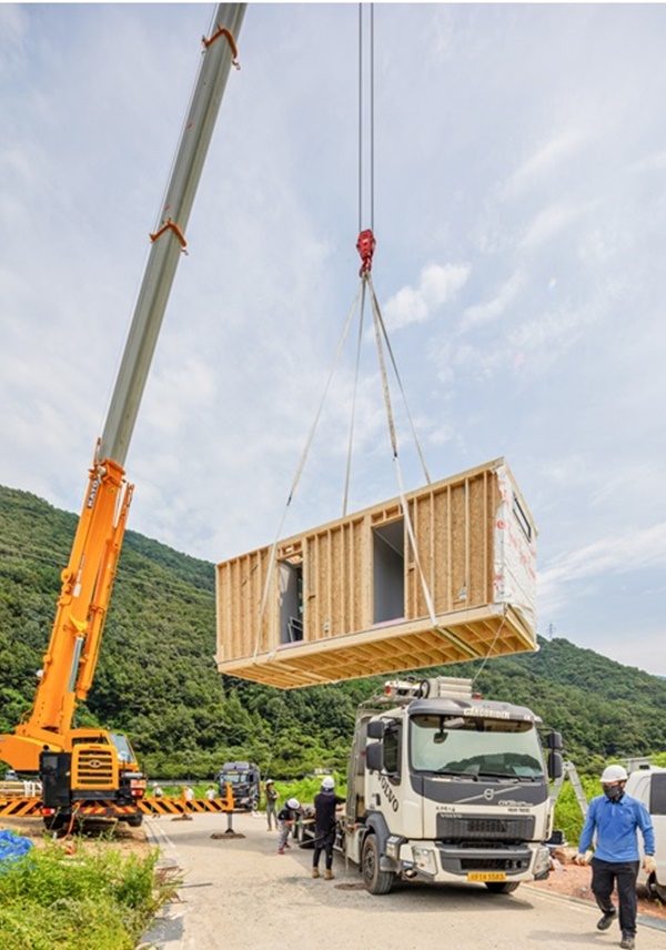 상부 인양 방식은 모듈 인양시 자체 개발한 양중 시스템과 밸런스빔으로 보다 높은 조립정밀도와 작업 안정성을 확보하는 것이 특징이다. 뿐만 아니라, 기밀성능을 갖춘 마감재를 적용하고 모듈간 팽창 테이프와 전용 장비 등으로 유격을 조정함으로써 기밀성능을 획기적으로 개선해 제로 에너지 주택 기밀성능 기준을 만족하는 기술을 확보하게 됐다고 GS건설측은 덧붙였다.