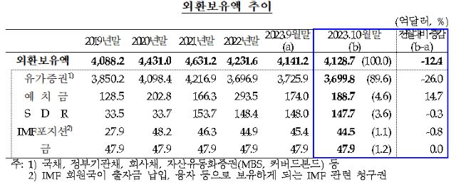 3일 한국은행이 발표한 ‘2023년 10월말 외환보유액’에 따르면 10월말 외환보유액은 4128억 7000만달러(550조 7272억 9300만원)로 집계됐다.