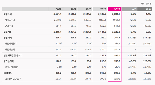 영업이익은 전력료 인상에 따른 기타비용 증가 영향으로 전년 동기 대비 10.8% 줄어든 2543억원을 기록했다. 마케팅비용은 지난해 대비 2.0% 감소한 5532억원으로 집계됐다. 서비스수익 대비 마케팅 비용 집행률은 20.6%를 기록, 전년 동기와 비교해 0.9%포인트 개선됐다.