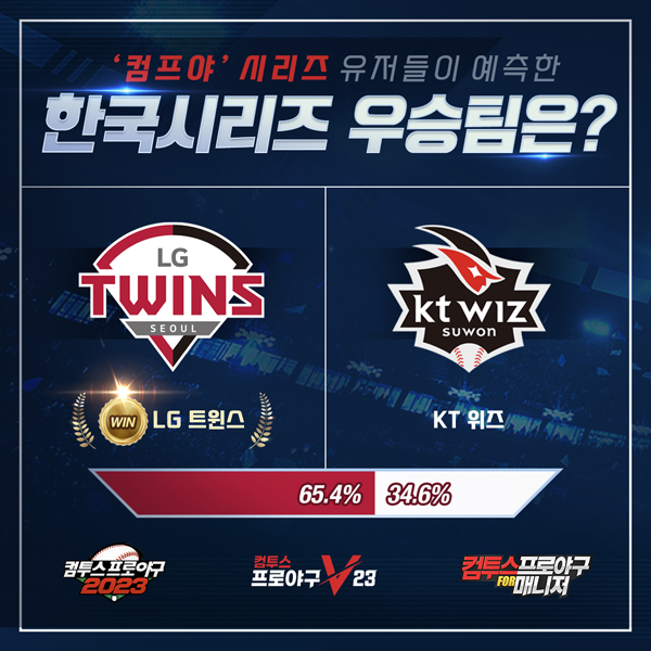 (서울=NSP통신) 이복현 기자 = 컴투스프로야구 유저들이 2023 한국시리즈에서 LG 트윈스가 kt위즈를 꺾고 우승을 차지할 것으로 전망했다.