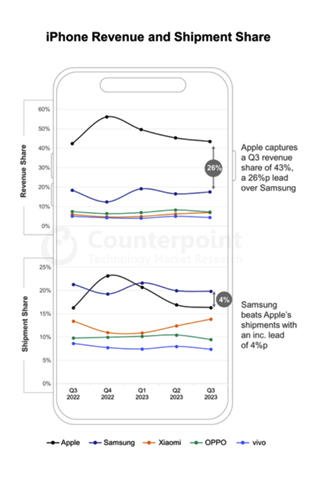 애플(Apple)은 글로벌 스마트폰 매출액의 43%를 가져가며 3분기 기준 역대 최고치를 기록했다. 이는 2023년 3분기 애플의 최신 아이폰 15 시리즈가 에 전년 동기 대비 출시 기간이 1주일 줄었음에도 불구하고 달성한 성과다. 최근 출시된 아이폰 시리즈는 중국에서 짧은 연휴 전 쇼핑 기간과 프로 맥스의 공급 불일치로 인해 저조한 실적을 거둔 것으로 보인다.
