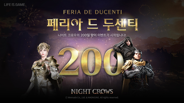 (서울=NSP통신) 이복현 기자 = 위메이드(대표 장현국)가 매드엔진(공동대표 손면석, 이정욱)에서 개발한 대작 MMORPG 나이트 크로우에서 서비스 200일 기념 이벤트 ‘페리아 드 두센티(FERIA DE DUCENTI)’를 시작했다.
