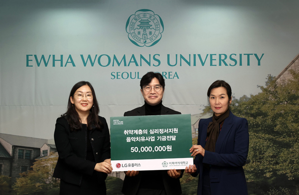 LG유플러스는 이화여자대학교 음악치료학과에 지원금 5000만원을 전달하고 악기 연주와 가창, 창작 중심의 음악활동을 통한 심리정서 지원 프로그램을 운영하기로 했다.