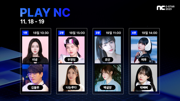 18일 10시 30분부터 2시간 동안 진행되는 PLAY NC 1부에서는 MC 정소림, 캐스터 최광원, 인플루언서 이녕과 김블루이 신작을 플레이한다. 같은 날 오후 3시부터는 MC 김효진, 캐스터 박상현, 인플루언서 우정잉과 나는루다가 무대에 오른다.