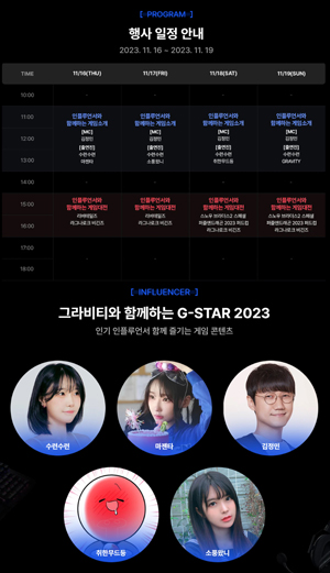 (서울=NSP통신) 이복현 기자 = 글로벌 게임 기업 그라비티가 국제 게임쇼 지스타2023 부스에서 인플루언서와 함께 진행할 부스 프로그램 및 이벤트를 공개했다.