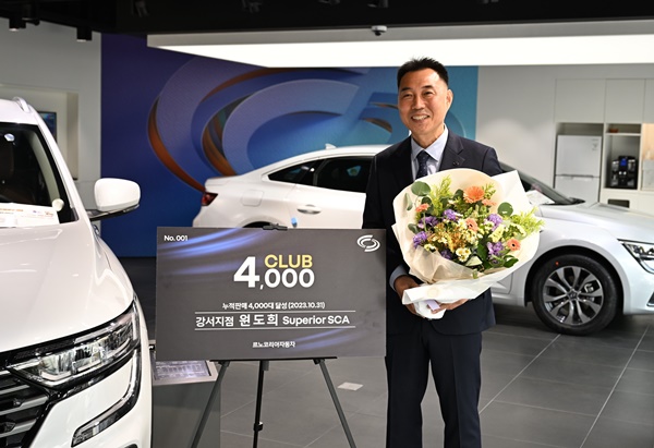 (서울=NSP통신) 강은태 기자 = 르노코리아자동차(대표 스테판 드블레즈, 이하 르노코리아)가 15일 자사 최초로 누적 판매 4000대를 기록한 르노코리아 강서지점 원도희 슈페리어에 대한 축하 기념식을 진행했다.