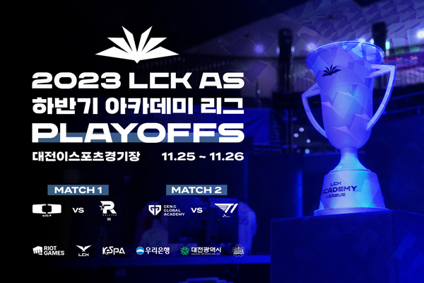 우리은행과 대전광역시, 한밭대전 페스티벌이 후원하는 2023 LCK AS 하반기 아카데미 리그 플레이오프는 오는 25일, 26일 양일간 대전 이스포츠경기장에서 오프라인으로 개최된다. 4강전은 25일 오전 11시 디플러스 기아 유스와 KT 아카데미의 경기로 시작하며, 1경기 종료 후 젠지 스콜라스와 T1 아카데미 루키즈의 경기가 이어진다. 결승전은 26일 오후 2시에 4강전에서 승리한 두 팀이 맞붙게 된다.
