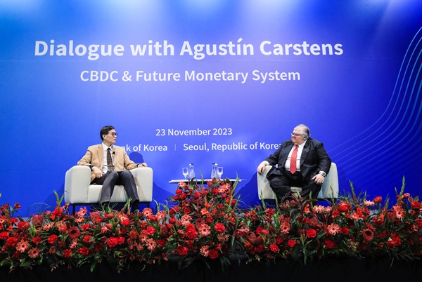 NSP통신-이창용 한국은행 총재와 Agustin Carstens 국제결제은행(BIS) 사무총장이 23일 오전 서울 중구 한국은행에서 CBDC와 미래 통화 시스템을 주제로 대담하고 있다. (사진 = 한은)