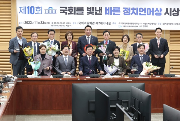 국회 일치를 위한 정치 포럼(공동대표 이명수·박찬대 의원)과 한국 정치 커뮤니케이션 학회(회장 김광재)는 23일 오전 국회의원회관 개최한 ‘제10회 국회를 빛낸 바른 정치 언어상 시상식’를 개최했다.