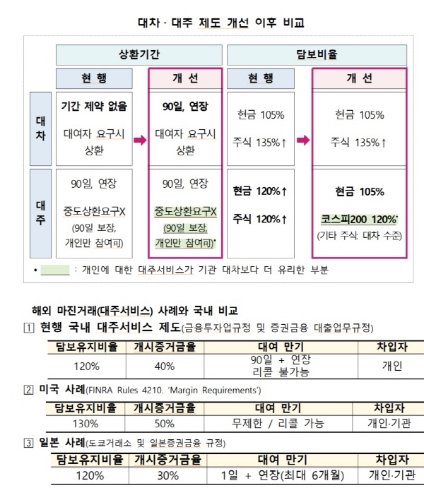 한국거래소, 한국예탁결제원, 한국증권금융, 금융투자협회 등의 합동 공매도 제도개선 방향의 주요 내용에 따르면 대차와 개인 대주 간 남아있는 상환기간과 담보비율 차이를 해소하도록 했다.