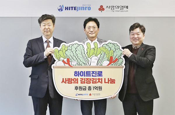 지난 28일 하이트진로는 서울 서초동 사옥에서 정세영 하이트진로 상무와 이재용 한우리정보문화센터 관장, 천부건 서울사회복지공동모금회 팀장 등이 참석한 가운데 김장지원금 전달식을 가졌다.