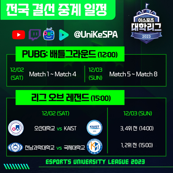 올해 전국 결선은 2일 개회식을 시작으로 PUBG 종목 경기 4라운드와 LoL 종목 6강 및 4강이 진행된다. LoL 6강은 전국 본선 3위, 6위인 오산대학교와 카이스트가 맞붙고, 4위, 5위인 전남과학대학교와 국제대학교가 대결한다. 이후 LoL 4강의 두 경기가 동시 진행될 예정이다. 다음날 3일에는 PUBG 종목 5라운드부터 8라운드까지 경기와 LoL 종목 결승전 및 3, 4위전이 진행된다. 이후 폐회식을 끝으로 2023 이스포츠 대학리그의 막이 내리게 된다.