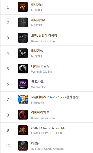구글플레이 공식 홈페이지에 따르면 콜 오브 카오스 : 어셈블은 지난 23일 정식 서비스를 시작한 지 6일 만인 29일 매출 순위 10위권에 집입, 최고 순위 8위까지 올랐다.