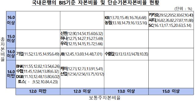 금감원은 “지난 9월말 국내은행의 자본비율은 규제비율을 상회하는 등 양호한 수준을 유지했다”며 “다만 고금리가 지속되는 가운데 환율 변동성이 확대되는 등 금융시장 불확실성이 여전하고 중국 경기 부진 등 대내외 경제여건도 악화되고 있는 만큼 충분한 자본여력을 확보할 필요가 있다”고 밝혔다.