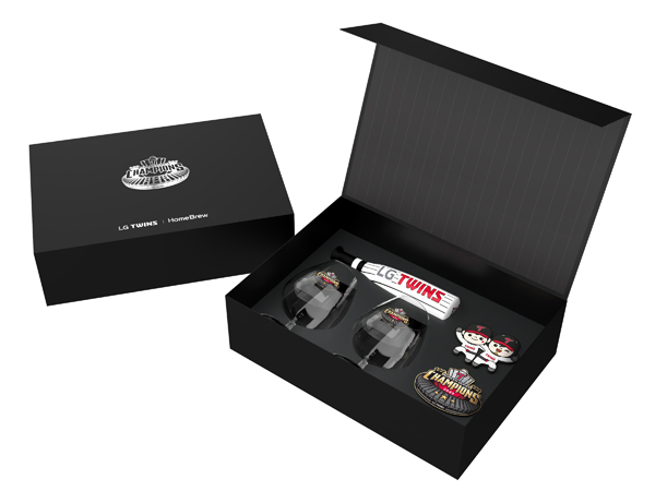 LG트윈스 로고가 적힌 홈브루 탭핸들, LG트윈스 마스코트 마그넷, LG트윈스 한국시리즈 우승 엠블럼이 새겨진 맥주잔 2개와 마그넷으로 구성돼 있다.