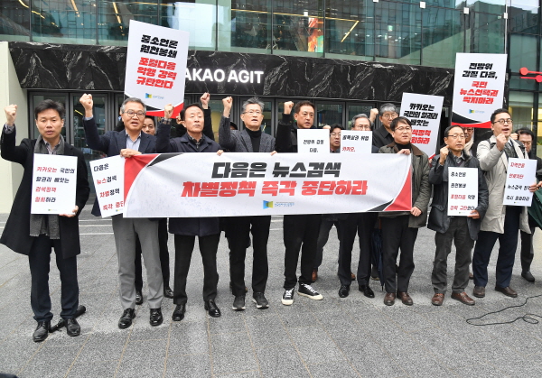 이 자리에서 이의춘 한국인터넷신문협회 회장은 “다음카카오의 뉴스검색 기본값 제한을 통한 차별은 국민들의 뉴스선택권을 왜곡하고 알권리를 침해하며 언론시장의 공정한 경쟁을 차단하는 폭거”라며 “다음카카오에 원상복구를 강력하게 촉구해 왔지만 상응하는 조치가 이뤄지지 않아 강력한 법적대응과 함께 집단행동에 들어간다”고 밝혔다.