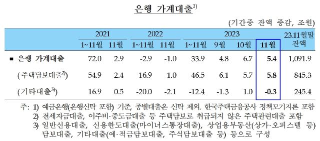 주담대는 주택매매 관련 자금수요가 둔화됐음에도 입주 물량 증가 등으로 잔금 수요가 확대되면서 전월과 비슷한 증가규모를 유지했다. 11월 주담대는 전월 대비 5조 8000억원 증가했다.