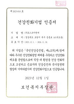 (서울=NSP통신) 강은태 기자 = 포스코이앤씨가 보건복지부와 한국건강증진개발원이 주관하는 ‘건강친화기업’ 인증을 획득했다.