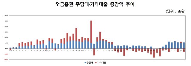 금융당국에 따르면 주택담보대출은 5조 6000억원 증가해 전월(5조 2000억원) 대비 증가폭이 소폭 확대됐다. 은행권 주담대 증가폭은 5조 7000억원으로 전월과 유사한 수준이지만 제2금융권 감소폭이 다소 축소된 영향이다. 기타대출은 상호금융권 비주택담보대출 및 예금담보대출 위주로 총 3조원 감소했다.