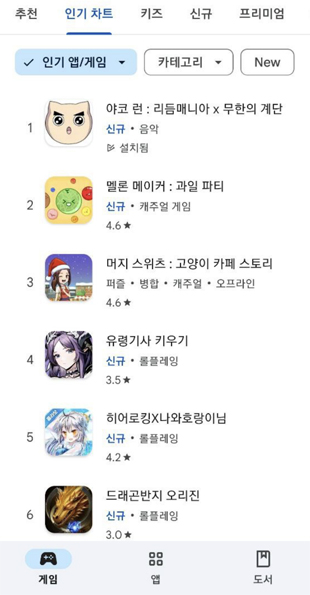 (서울=NSP통신) 이복현 기자 = 넵튠(217270)의 신작 모바일게임 ‘야코런 리듬매니아(이하 야코런)’가 구글 플레이스토어 인기 게임 순위 1위를 달성했다.