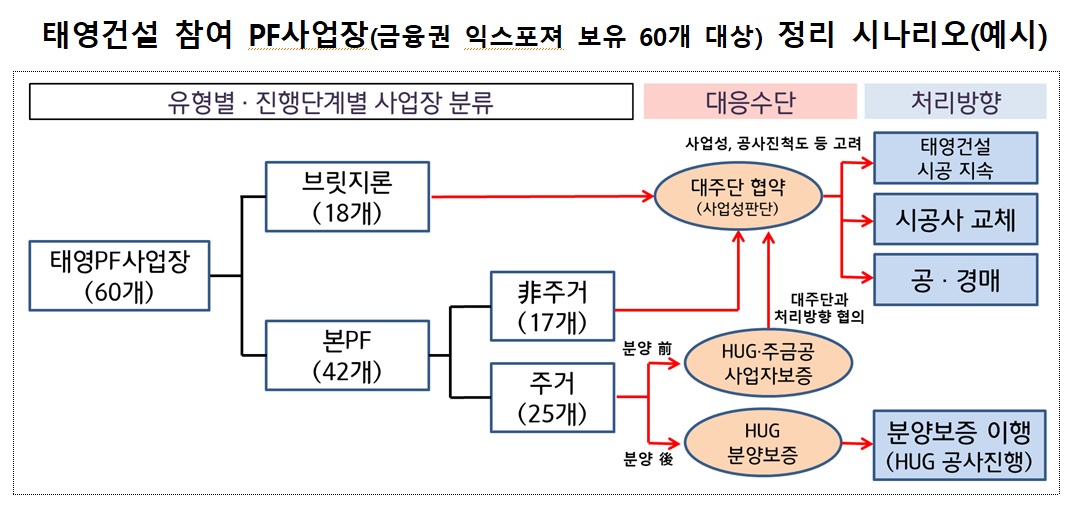 정부 등 관계기관은 이미 파악 중인 태영건설의 PF사업장, 협력업체, 수분양자 현황을 바탕으로 신속한 대응을 추진한다는 기조하에 태영건설 관련 60개 PF사업장 중 양호한 사업장은 정상 사업추진하고 유사시 HUG 분양계약자 보호조치와 함께 정상 진행에 어려운 사업장은 시공사 교체‧재구조화‧매각 등을 추진한다.