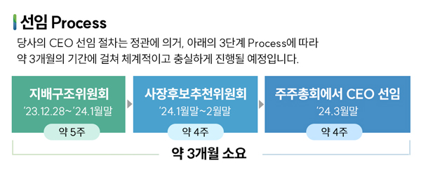 사내 사장 후보 Pool은 2020년부터 운영 중인 ‘고위경영자 육성 프로그램’ 대상자 및 사장으로 구성된다. 지배구조위원회는 사외 및 사내 사장 후보 Pool 중 공정한 심사를 거쳐 사장 후보군(롱리스트)을 결정할 예정이다.