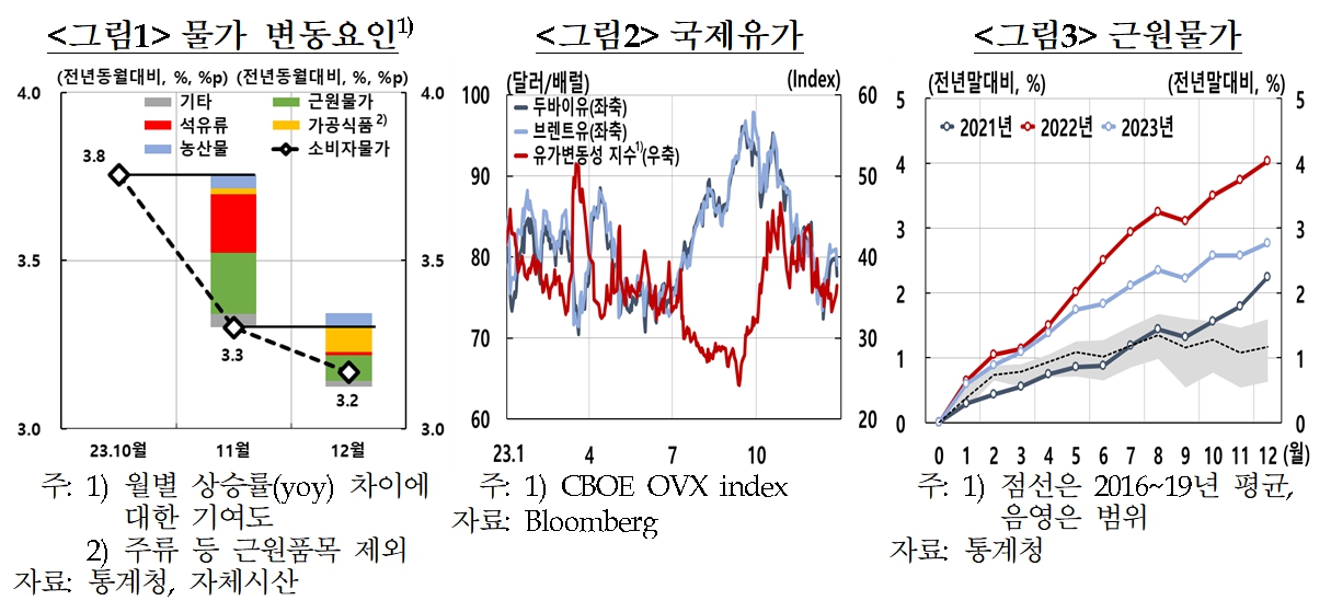 김웅 부총재보는 이날 회의에서 12월 물가상승률에 대해 “소비자물가 및 근원물가 상승률 모두 전월 대비 0.1%p 낮아지면서 둔화 흐름을 이어갔다”고 말했다. 12월 소비자물가상승률은 3.2%다. 지난 10월 3.8%, 11월 3.3%로 내림세를 보이고 있다.