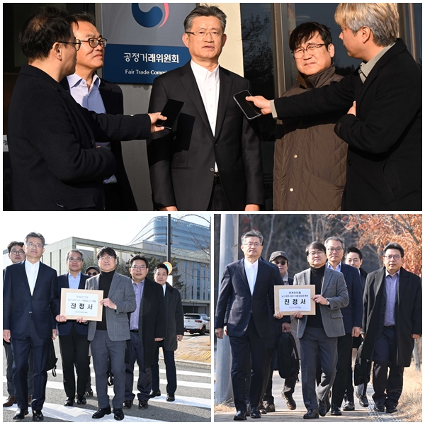한국인터넷신문협회 이사진과 비상대책위원 대표단이 세종시 공정거래위원회 앞에서 진정서 제출 전에 기자회견을 하고 있다. (사진 = 한국인터넷신문협회)