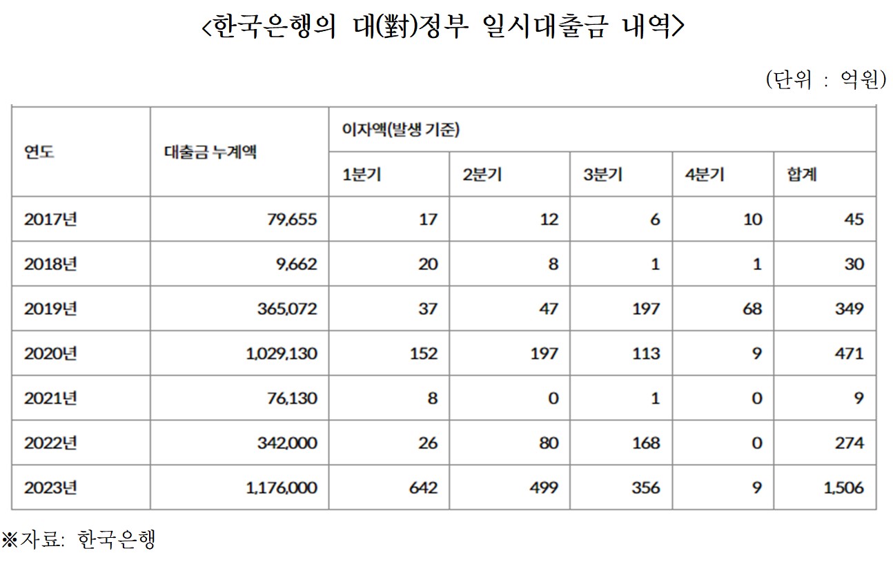 일시대출금은 코로나19 확산으로 정부 지출이 확대됐던 2020년 대출액(102조 9130억원)을 넘어섰다. 대출금이 늘면서 정부가 지급한 일시대출금 이자액은 지난해 1506억원에 이른다.