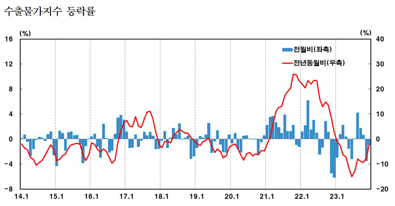 (서울=NSP통신) 강수인 기자 = 지난달 수출입물가지수가 동반 하락했다. 이른바 ‘홍해 리스크’의 영향이 아직은 미치지 않은 것으로 보인다. 한국은행은 홍해 리스크를 지켜봐야 한다는 입장이다.