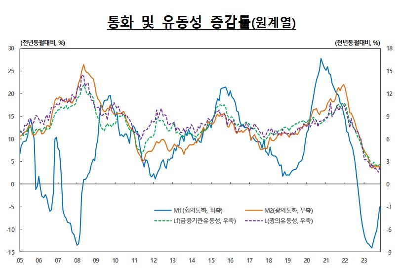 협의통화(M1) 평잔(계열조정계열 기준)은 1201조 7000억원으로 전월 대비 4조 3000억원 늘었으나 증가폭은 전월에 비해 축소됐다.