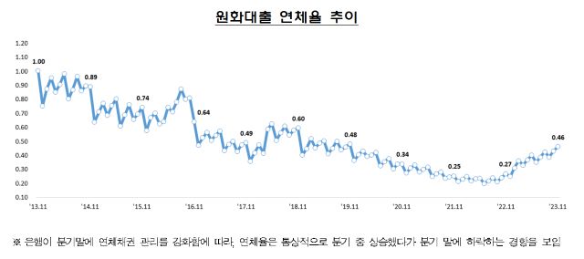 25일 금융감독원이 발표한 ‘2023년 11월말 국내은행의 원화대출 연체율 현황(잠정)’에 따르면 1개월 이상 원리금이 연체된 비율은 0.46%로 전년 동월 대비 0.19%p 상승했다.