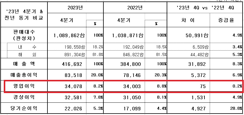 2023년 4분기 매출액은 전년 동기대비 8.3% 증가한 41조 6692억 원으로 집계됐다. 판매 대수 증가, 선진시장 중심 지역 믹스 개선 등을 통해 매출액이 늘었다. 2023년 4분기 원·달러 평균 환율은 전년 동기대비 2.8% 하락한 1321원을 기록했다.